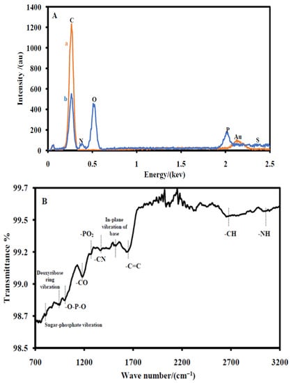 (A) EDS of the CSPE/CNFs–AuNPs (a) and the CSPE/CNF–AuNP/Aptamer (b). (B) ATR spectrum of the CSPE/CNF–AuNP/Aptamer.