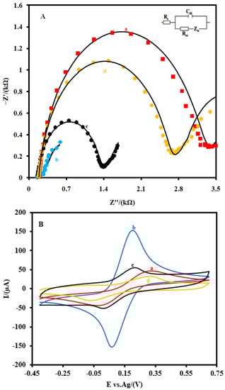 (A) EIS and (B) CVs and of the CSPE (a) the CSPE/CNFs–AuNPs (b), the CSPE/CNF–AuNP/Aptamer (c), and the CSPE/CNF–AuNP/Aptamer/SARS-CoV-2-RBD (d) at 0.1 M 5.0 mM Fe(CN)63−/4− solution (0.1 M PBS, pH 7.4). The equivalent electric circuit is compatible with the Nyquist diagrams. Rs: Solution resistance; Rct: charge transfer resistance; Cdl: Double layer capacitance; Zw: Warburg impedance. The AC amplitude voltage was 10 mV, DC voltage was 0.13 V, and frequency range was 100 kHz−0.1 Hz. The solid black lines indicate fitting curves. CVs were recorded at the scan rate of 0.05 V·s−1.