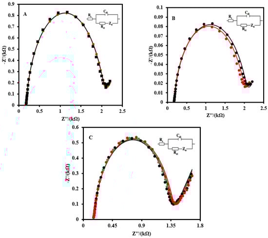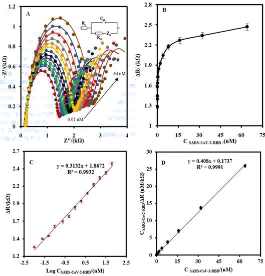 Figure 4 shows the EIS (A) as well as the linear (B) and logarithmic corresponding calibration plot response (C) of the CSPE/CNF–AuNP/Aptamer to the different concentrations of SARS-CoV-2-RBD in the measuring buffer, respectively. As shown in Figure 4A, the Rct of the biosensor increased as the concentration of SARS-CoV-2-RBD increased. The corresponding calibration plot shows that the response of the proposed biosensor had a logarithmic relationship with the concentration of SARS-CoV-2-RBD in the range of 0.01–64.0 nM (Figure 4B). The linear–logarithmic regression equation of the calibration curve (Figure 4C) is expressed as Equation (4):