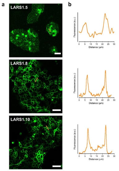 Cellular expression of candidate biosensors in HEK293 cells. Confocal images of live HEK293 cells transfected with LARS1.5, LARS1.8, and LARS1.10 and observed 48 h after transfection. Images show endogenous cpGFP fluorescence (λex = 488 nm) (a). A representative profile plot across cells (at sites indicated by orange lines in left panel) is shown next to the candidate biosensors (b). Scale bar, 50 µm.