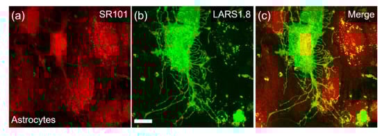 Cellular expression in primary mouse astrocytes. Confocal images of live mouse astrocytes transfected with LARS1.8 and observed 48 h after transfection. (a) SR101 dye staining (λex = 561 nm), (b) endogenous cpGFP fluorescence (λex = 488 nm), and (c) merged image. Note the cpGFP green staining extending to the finest membrane processes. Scale bar, 20 µm.
