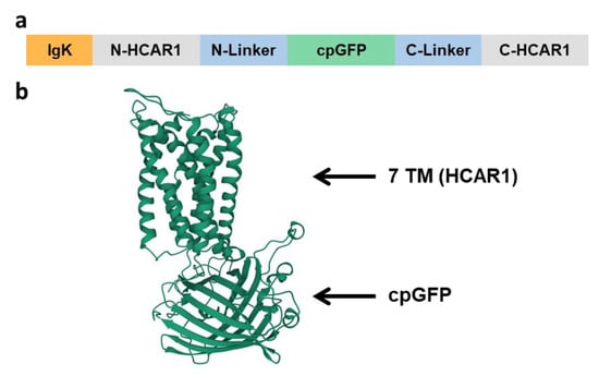 In our study, we investigated whether the strategy used previously for several neurotransmitters based on their respective specific GPCRs [] could be deployed to develop a lactate-sensitive fluorescence biosensor, and constructed an intensiometric fluorescent lactate-sensitive biosensor based on the HCAR1 lactate receptor coupled to cpGFP.