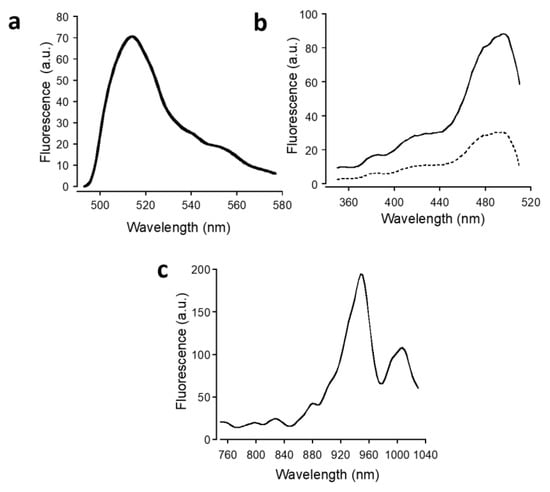 The fluorescence emission and excitation spectra of LARS1.8 recorded on live HEK293 cells are depicted in Figure 4a,b. The excitation spectrum displayed the typical −400 nm and −490 bands of cpGFP corresponding to the neutral and anionic form of the protein, while emission peaked at −515 nm as observed with the calcium indicator series GCaMP []. Two-photon excitation of LARS1.8 using a pulsed femtosecond infrared laser is depicted in Figure 4c. The optimal two-photon excitation wavelength was found at 950 nm, while a second two-photon absorption band was observed at −1000 nm.