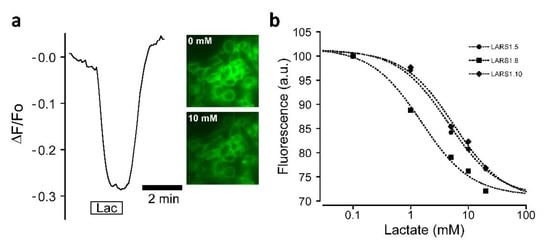 LARS 1.8 was first selected for functional testing as it displayed the most clearly defined membrane expression. The fluorescence of LARS1.8 expressed in HEK293 cells was found to exhibit pronounced changes following lactate application. Interestingly, an inverse response was observed corresponding to rapid and reversible fluorescence decreases (Figure 5a). This inverse response could already be seen in the excitation spectra measured in the presence and absence of lactate (Figure 4b), which indicated that lactate caused a homogenous decrease in LARS1.8 fluorescence. The dynamic range of fluorescence over the binding curve is in the range of 30%, providing an ample fluorescence window for sensing concentration changes. Similar inverse responses to lactate application were also observed with the LARS1.5 and LARS1.10 constructs expressed in HEK293 cells (Figure 5b). The apparent affinity of the three LARS constructs was estimated to be 4.5 ± 1.5 mM, 1.5 ± 1.5 mM, and 5.6 ± 2.1 mM for LARS1.5, LARS1.8, and LARS1.10, respectively. These apparent EC50 values affinities are in the range reported for HCAR1 [,].