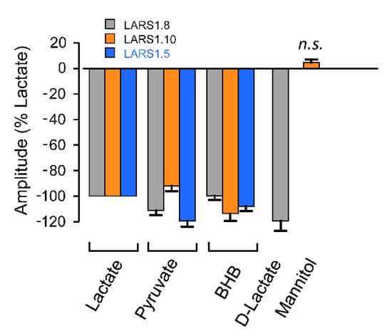 Selectivity candidate biosensor responses. The amplitude of responses of LARS1.8 (n = 16 cell groups), LARS1.10 (n = 14–17 cell groups) and LARS1.5 (n = 3 cell groups) to pyruvate (10 mM), and β-hydroxybutyrate (10 mM). Additionally, D-lactate (10 mM), sensitivity and lack of sensitivity to mannitol (10 mM) were observed. Responses were normalized to the response to lactate (10 mM) on the same cells.