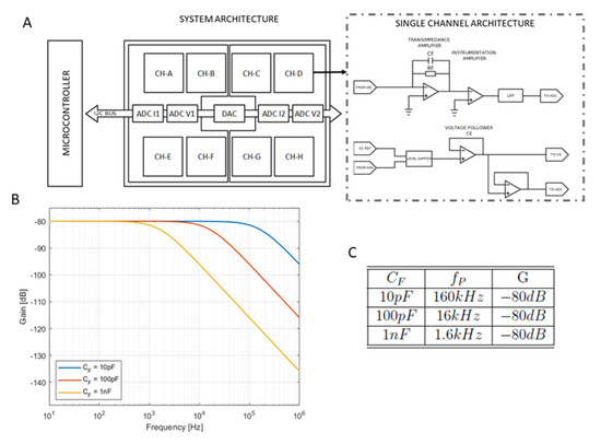 The electronic readout circuit is capable of driving up to 8 channels and is composed of 8 individual analog read-out circuits that polarize the electrodes and read the currents and voltages. The polarization signals of the 8 circuits are generated by an 8-channel digital-to-analog converter of 12 bits (AD5629RARUZ-1 from Analog Devices) and the input voltages and currents are sampled by 12 bit analog-to-digital converters (LTC2309 from LinearTechnology, Milpitas, CA, USA), as represented in Figure 2A (system architecture). These components are connected to an Inter-Integrated-Circuit (I2C) bus that constitutes the communication channel with the microcontroller of the system. This microcontroller runs the firmware of the system that controls the converters and digital gains as well as the communication with the LabView® interface of the system.