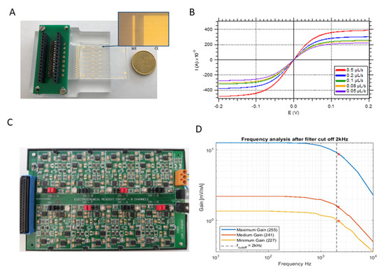 (A). Figure representing the final microfluidic device on the chip holder. A zoom on the embedded electrochemical cell is reported. (B). Characterization response of the embedded electrochemical cells (using a BioLogic VSP 300) at different flow rates after its fabrication. (C). Dedicated electronic circuit developed for the multiplexed readout of up to 8 different sensors. (D). Frequency response characterization of the analog stage comprising the current−voltage conversion, amplification and filtering for different values of gain: maximum gain (blue), medium gain (red) and minimum gain (yellow). The dotted vertical line represents the theoretical cut off frequency, and the red stars the found cut off frequency for each measurement.