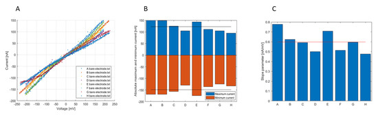 (A). CV curves for each channel of the device. Characterization of bare gold electrodes. (B) Absolute maximum (blue) and minimum (red) currents histogram for each device channel, values from Figure 4A. The black lines are for the mean values. (C) Fitted slope parameters histogram CV curves in Figure 4A, the red line is for the mean value.