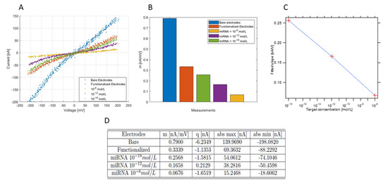 To summarize, the slope of the measured curve is related to the faradic current of the electrochemical cell that is directly related to the area of the electrode exposed to the redox tracer solution. When the electrodes are not functionalized, the gold surface of the electrode is completely exposed to the solution, and, thus, the faradaic current is maximum. After the formation of the self-assembled monolayer (SAM) on the surface of the electrodes, the coverage of the electrode increases, and, thus, the faradaic current and the slope reduces. With higher concentrations of miRNA, the electrode surface coverage due to the hybridization between the immobilized DNA-probes with the DNA targets increases, and, thus, the slope decreases.