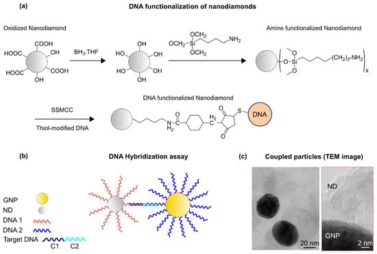 (a) DNA functionalization of nanodiamonds. (b) Principles of DNA-induced nanoassembly. DNA-functionalized nanoparticles form conjugates via hybridization by a target DNA that contains sequences complementary to both GNP and nanodiamond tags. Nanodiamonds and GNPs are functionalized with DNA1 and DNA2, respectively. The target DNA is composed of C1 and C2, complementary sequences to DNA1 and DNA2, respectively. (c) A transmission electron microscope (TEM) image of a coupled GNP–nanodiamond structure.