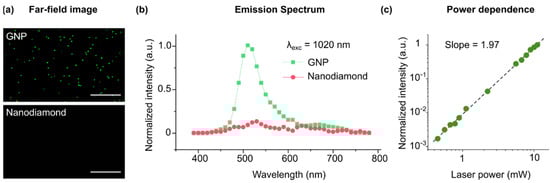 Multiphoton emission from single GNPs and nanodiamonds. (a) Far-field optical images obtained by multiphoton excitation of GNPs and nanodiamonds at λ = 1020 nm and ~1 mW excitation power. No detectable signal was observed in the nanodiamonds (at λ = 1020 nm and ~1 mW). Scale bars, 10 µm. (b) The corresponding average emission spectrum of the GNP and nanodiamonds. GNP emission was centered at 520 nm. (c) The emission intensity in GNP increases with excitation power almost quadratically (slope = 1.97 in the log scale).