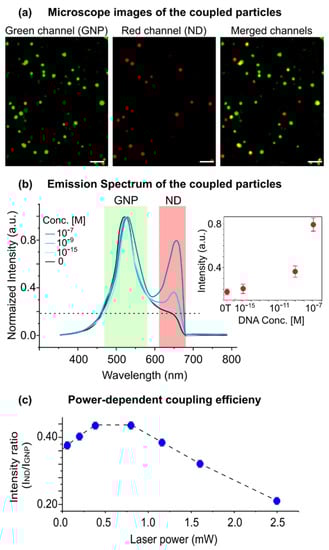 In the next step, we examined the optical coupling between the GNP–nanodiamond pairs under multiphoton illumination (Figure 3). The resonant LSP scattering of a GNP can radiate both into the far-field (detected by the microscope) and into the electronic states of the neighboring nanodiamonds (coupling). A strong modification of the luminescence spectra was observed in the coupled particles. A second peak at ~650 nm appeared, which matched well with the emission of the NV− centers in the nanodiamonds. Consequently, the spectrum consisted of two peaks at ~520 and ~600–700 nm, which were correlated with the emission of the GNPs and the photoluminescence of nanodiamonds, respectively. The intensity of the nanodiamond emission increased by increasing the number of the coupled particles (i.e., by increasing the concentration of the target DNA in the hybridization assay: e.g., 0, 10−15, 10−9 and 10−7 M). For the non-assembled particles (i.e., 0 M concentration of the target DNA), the distance between the nanodiamond and the GNP was too large for an effective coupling, and thus the second peak did not appear. These results suggest that the excitation of the nanodiamonds under multiphoton irradiation was due to the near-field excitation by the neighboring GNPs.