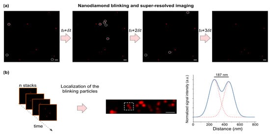 Nanodiamonds are attractive biomarkers in sensing applications because of their strong and stable fluorescence emission, robust structure and excellent biocompatibility [,,]. Fluorescence emission in nanodiamonds is due to naturally occurring or implanted crystal defects, such as nitrogen vacancies (NV0 and NV-centers) [,]. The optical transitions in NV centers are sensitive to electromagnetic fields, temperature, pH and the nanoscale environment, enabling the localized sensing of small changes in complex environments [,,]. For example, a nanodiamond can be integrated with an atomic force microscope (AFM) to scan across a cell membrane or other surfaces, via measurement of the quantum decoherence of the NV probe [,]. Particularly, NV centers in nanodiamonds have been utilized for the imaging of cells, organisms and animals [,,,]. More recently, with the rise of super-resolution microscopy (SRM) [,], NV centers have attracted attention as potential probes for SRM [].