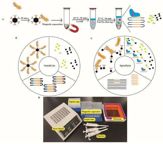Design and working principle of the ICB-LAMP-CRISPR/Cas12a method. (A) Schematic of the ICB-LAMP-CRISPR/Cas12a method. Campylobacter jejuni was captured by the prepared ICB and separated magnetically. Five microliters of template DNA of C. jejuni was added to the LAMP mixture, which was placed at the bottom of the tube and sealed with 20 μL of mineral oil. The CRISPR/Cas12a reaction reagents are added inside the lid. After 30 min of LAMP amplification at 65 °C, the tube was shaken to mix with Cas12a reagents for cleavage. Once the Cas12a nuclease is activated by recognizing the DNA target, it splits the quenched fluorescent ssDNA-FQ probe indiscriminately, generating a fluorescence signal visible to the naked eye under blue light. (B) Enhanced sensitivity of the ICB-LAMP-CRISPR/Cas12a method. The sensitivity was enhanced in three parts: the enrichment of ICB, the high efficiency of LAMP amplification, and the indiscriminate cleavage of the fluorescent ssDNA-FQ probe. (C) Enhanced specificity of the ICB-LAMP-CRISPR/Cas12a method. The specificity was enhanced from three parts: the specific antibodies of C. jejuni coated in the magnetic beads, the LAMP primers designed based on the conserved hipO gene, and the cleavage activity of Cas12a guide by the specific sgRNA. (D) Work conditions of the nearly instrument-free POC diagnostics. Equipment and consumables needed for running the ICB-LAMP-CRISPR/Cas12a method include a heat block, pipettes, pipette tips, sample tubes, and T-green transilluminator.