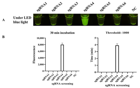 sgRNA screening. (A) Endpoint CRISPR/Cas12a for sgRNA screening. Six sgRNAs were designed based on the target DNA and used in CRISPR/Cas12a at 37 °C for 30 min, and sgRNA 4 worked well in the standard program, with strong fluorescent light under LED blue light. (B) Real-time CRISPR/Cas12a for sgRNA screening. The real-time monitoring was conducted in a CFX96 Touch Real-Time PCR Detection System for 30 min, and the endpoint fluorescence intensity and time with a fluorescence threshold of 1000 were monitored. Each experiment was repeated three times with similar results.