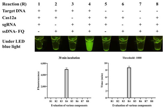 Evaluation of eight CRISPR/Cas12a reactions (R) with various components through endpoint imaging after 30 min of incubation and real-time fluorescence detection. The LAMP products, Cas12a, sgRNA, and the ssDNA-FQ reporter were tested. After incubation at 37 °C for 30 min, only reaction 4, containing the target nucleic acid sequence, sgRNA, Cas12a, and the ssDNA-FQ reporter, produced a superbright fluorescence signal under LED blue light. The real-time monitoring was conducted in a CFX96 Touch Real-Time PCR Detection System for 30 min, and the endpoint fluorescence intensity and time with a fluorescence threshold of 1000 were monitored.