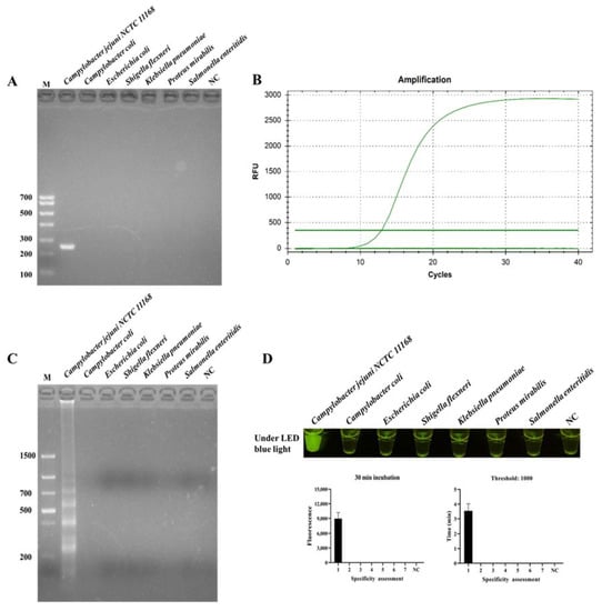 Specificity evaluation ICB-LAMP-CRISPR/Cas12a method. The specificity of ICB-LAMP-CRISPR/Cas12a was compared with PCR, qPCR, and LAMP. C. jejuni NCTC 11168 and 6 non-C. jejuni (C. coli, E. coli, S. flexneri, K. pneumoniae, P. mirabilis, and S. enteritidis) were used as the tested sample. The specificity evaluation results of PCR and LAMP were shown by agarose gel electrophoresis. The specificity evaluation results of qPCR and ICB-LAMP-CRISPR/Cas12a are shown by the real-time amplification curve and end-point fluorescence. (A) The specificity evaluation of PCR. (B) The specificity evaluation of qPCR. (C) The specificity evaluation of LAMP. (D) The specificity evaluation of the ICB-LAMP-CRISPR/Cas12a method.