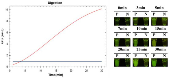 To confirm the time of fluorescent signal production, the cleavage procedure of CRISPR/Cas12a was monitored using a CFX96 Touch Real-Time PCR Detection System and real-time photograph detection. A 1 mL sample of C. jejuni (8 × 103 CFU/mL) was detected via the ICB-LAMP-CRISPR/Cas12a method. A visible fluorescence signal was produced at 3 min, and then the fluorescence signal became stronger with time (Figure 7). To cover as many unexpected conditions as possible (especially low concentration samples), increase the error-tolerance rate, and maximize the cutting effect of Cas12a, 10 min was chosen in the following tests.