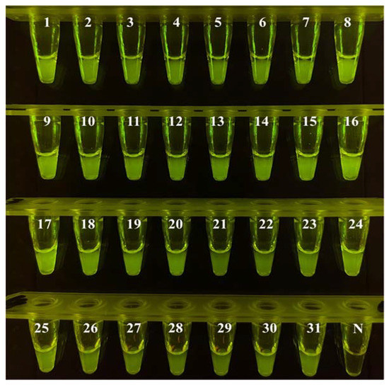 After a series of experimental optimizations, the finalized conditions of the ICB-LAMP-CRISPR/Cas12a method were obtained. The C. jejuni-positive fecal samples (n = 31) from different layer farms were used for the actual sample evaluation of ICB-LAMP-CRISPR/Cas12a. One hundred milligrams of fecal sample were resuspended in 1 mL of PBS, which was then captured by ICB for 20 min and resuspended in 5 μL of ddH2O. After magnetic separation, the template DNA was released at 100 °C for 10 min. The template DNA was used as a template for the LAMP reaction, which was incubated at 65 °C for 30 min and then mixed with the CRISPR/Cas12a system at 37 °C for 10 min. All operations could be completed in any environment, with the use of heat blocks, a magnetic separator, pipettes, tips, and a T-green transilluminator (Figure 1D). All results were visible under LED blue light. All 31 C. jejuni-positive fecal samples were detected by ICB-LAMP-CRISPR/Cas12a in 70 min (Figure 8). These results illustrate the simplicity and versatility of the ICB-LAMP-CRISPR/Cas12a method.