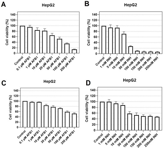 The HepG2 cell viability after exposure to various concentrations of AFB1 (A) and INH (B) when stained with neutral red and cell viability following the Coomassie Brilliant Blue staining test for AFB1 (C) and INH (D). The results are given as mean values of the three measurements ± STD (p < 0.001).
