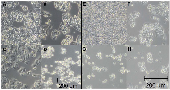 Qualitative analysis of cell viability was carried out using an optical microscope Axio (Zeiss, Germany). Cells were seeded with a density of 1.5 × 104 cells/cm2 (2.78 × 104 cells/mL) in two different 12-well plates and were incubated for 48 h at 37 °C and a 5% CO2 atmosphere. Cells were exposed to AFB1 at concentrations of 5, 50, and 250 μM and to INH at concentrations of 5, 50, and 150 mM for 24 h. Afterward, a qualitative exposure analysis of cell viability was carried out. All optical microscopy measurements were performed at 20× times magnification.