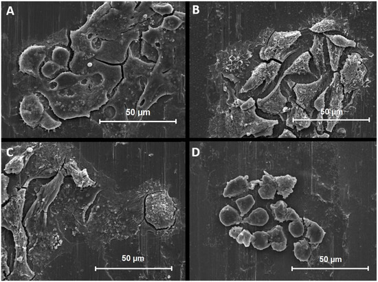 SEM photographs of the HepG2 cells exposed to increasing concentrations of AFB1 at 1000× magnification. HepG2 cells were exposed to different concentrations starting with the control (A), 5 µM (B), 50 µM (C), and 250 µM (D).