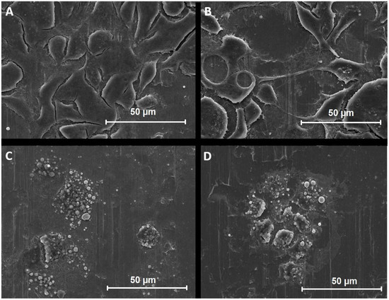 Surfaces with adhered cells were washed in phosphate buffer (PBS) for 30 min. Afterward, the cells on the surfaces were immersed for 48 h at 4 °C in Karnovsky fixative, prepared from 2.5% glutaraldehyde (SPI Supplies, West Chester, PA, ZDA), and 0.4% paraformaldehyde (Merck KGaA, Darmstadt, Germany) in 1 M NaH2PO4·2H2O and Na2HPO4·2H2O (Merck KGaA, Darmstadt, Germany). Cells were washed with 1 M phosphate buffer saline, fixed with 1% OsO4 (SPI Supplies, West Chester, PA, USA), and rinsed with distilled water. The cell surfaces were washed in an oversaturated and filtered tiocarbohydrase (TCH) solution, rinsed with distilled water, fixed with 1% OsO4, and rinsed again with distilled water. Samples were dehydrated with ethanol at concentrations of 30%, 50%, 70%, 80%, 90%, and absolute ethanol (Merck KGaA, Darmstadt, Germany). Further dehydration rates were performed with a mixture of hexamethyldisiloxane (HMDS; SPI Supplies, West Chester, PA, USA) and absolute ethanol in a ratio of 1:2 and ratio of 1:1, and with the absolute HMDS. After 24 h, samples were resurfaced with a 6 nm thick coat of Au/Pd using a precision etching and coating system (PECS). Scanning electron microscopy was carried out to visualize the morphology of adhered HepG2 cells on stainless steel surfaces using a scanning electron microscope JSM-7600 F (JEOL, Tokyo, Japan). Microphotographs were recorded at 100×, 1000×, and 5000× magnification.