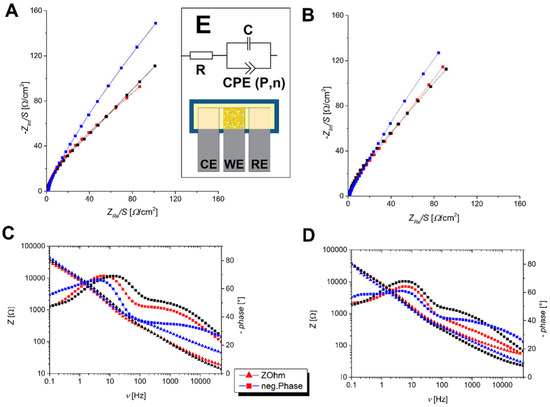 Nyquist diagrams of investigated biosensors showing a response for aflatoxin B1 (A) and isoniazid (B), along with Bode diagrams for aflatoxin B1 (C) and isoniazid (D). For Bode diagrams, triangles represent total impedance |Z|, while squares represent phase change. Both biosensors that had applied hepatotoxin are marked with a black label, where the control measurement is marked with the blue label and the biosensor without any attached cells is marked with the red label. Units are Ω/cm2 where the impedance response is normalized for the surface of the WE. A schematic of the biosensor with electrode placement (E bottom) along with fitted circuit for EIS analysis (E top) is also shown.