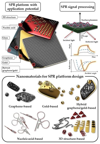 SPR sensors based on novel materials are actively being developed. For example, some metals, such as gold film or particle-based SPR platforms, are used to facilitate particle generation and optimise plasmonic performance [48,49,50,51,52,53,54,55]. For instance, graphene-based SPR platforms have excellent analyte adsorption properties, great corrosion resistance, and high thermal resistance [56,57,58,59]. Hybrid graphene/gold-based SPR platforms maximise plasmonic performance via graphene–gold interactions [60,61,62,63,64]. Aptamer-based SPR sensors reportedly exhibit uniquely high analytical specificity [65,66,67,68]. Three-dimensional (3D) structure-based SPR platforms possess a higher surface area than their 2D counterparts, which increases the likelihood of the analyte binding to the platform [69,70,71]. Additionally, these nanomaterials are not only highly biocompatible but also have fewer negative environmental impacts. In fact, some of these materials are actively used for environmental remediation [72,73]. SPR biosensors are therefore often used as a preliminary diagnostic tool, as they enable efficient and high-throughput diagnosis due to their fast detection time and the fact that they do not require labelling [74,75]. In this section, SPR platforms were classified into five categories depending on the materials used for pathogen sensing: (1) graphene oxide-based, (2) gold-based, (3) hybrid graphene/gold-based, (4) nucleic acid-based, and (5) 3D structure-based (Table 1). In this review, different SPR-based sensing techniques that can rapidly detect pathogens, such as viruses and bacteria, are investigated and discussed (Figure 1).