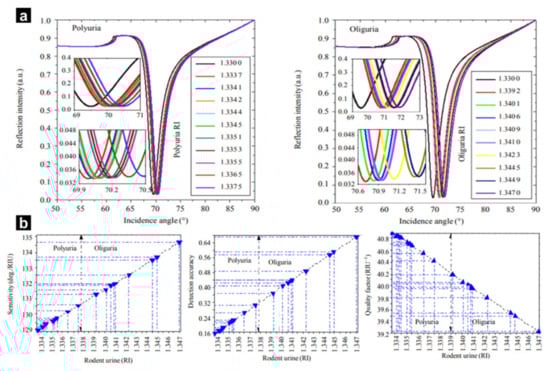 (a) SPR signal intensity vs. incident angle plot with polyuria (left) and oliguria (right). (b) Variation in parameters for different sensing medium refractive indices in pure water, polyuria, and oliguria. With permission from [76], Copyright 2020, Springer.