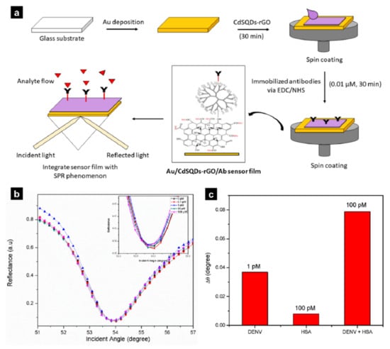 Omar, N.A.S. et al. developed a hybrid graphene/gold sensor to detect the dengue virus by thinly coating reduced graphene on a gold film [83]. The generated SPR platform was coated with gold in the form of a film through deposition on a glass substrate, and graphene was thinly coated through spin-coating (Figure 4a). This hybrid sensor achieved a detection limit of 28 fM and a linear range of 0 pM to 10 pM, as determined with a dengue virus solution (Figure 4b). A sample of 100 pM human serum albumin (HSA) was used for the selectivity test, and the fabricated platform reacted only with the dengue virus and showed low reactivity to HSA (Figure 4c). These results demonstrated that the hybrid graphene/gold SPR sensor could potentially be used in health and environmental monitoring. In addition to gold films, gold nanoparticles, an important type of plasmon nanoparticles, possess excellent plasmonic properties and have thus begun to be implemented in a variety of applications. The use of particles maximises the surface area of the gold film and graphene oxide complex. At the same time, the spherical gold nanoparticles adsorb to the graphene to enhance adsorption and plasmonic performance [84]. An SPR sensor was developed by combining graphene oxide and spherical gold nanoparticles through sonication and stirring. The researchers detected A-type and O-type foot-and-mouth disease viral particles through the resulting substrate and achieved limits of detection of 100 fg/mL and 100 pg/mL, respectively. Because of the characteristics of the GO on the substrate, single-stranded DNA (ssDNA) can readily bind to the sensor through electrostatic interactions, and thus the limit of detection is 1000 times lower than that of conventional PCR. Therefore, combining pristine gold nanoparticles and GO can greatly improve the limit of detection of biosensors.