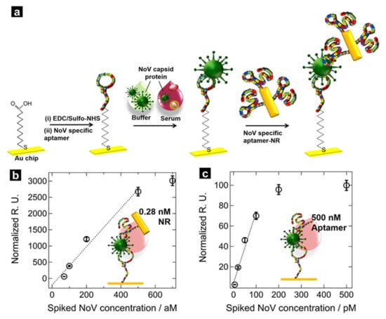 Although the sandwich aptamer technique can achieve high levels of sensitivity, its plasmonic effect could be further improved. Therefore, studies on the binding of metals to the secondary aptamer have been actively conducted, and a recent study demonstrated that the SPR effect could be improved by binding gold nanoparticles [88]. The researchers connected the primary aptamer to a gold chip through chemical conjugation, after which the norovirus capsid protein was bound (Figure 5a). The secondary aptamer was bound to the analyte while attached to gold nanorods, which were fabricated through the seed-growth method. The limit of detection of the generated SPR sensor was approximately 70 aM, thus demonstrating that the sensor was very sensitive to the analyte (Figure 5b). Notably, the signal was 105 times stronger than when gold nanorods were not used (Figure 5c). Additionally, by using two aptamers as capturing reagents for the norovirus capsid protein, non-specific binding events of other substances could be minimised. The aptamer–aptamer surface sandwich SPR platform with nanorod amplification is a promising means for the direct analysis of difficult-to-detect virus samples, and a wider variety of analyte-specific aptamers is expected to be developed in the future.
