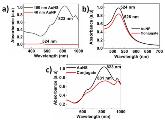 UV–vis absorption spectra were collected to investigate the plasmonic properties and stability of AuNPs, AuNSs, AuNP–TSH conjugates, and AuNS–TSH conjugates. All the materials were diluted to 1 OD, and UV–vis spectra were acquired using a quartz cuvette of 300 µL volume and 1 cm path length. The as-obtained UV–vis spectra are shown in Figure 1, and the uncertainty in the plasmonic peak position for all the spectra was less than 1 nm. Figure 1a shows the UV–vis spectra of 40 nm AuNPs and 150 nm AuNSs obtained at equal particle number. In the case of AuNSs, the resonance peak was observed at 823 nm with OD close to 1. In the case of AuNPs, the resonance peak was observed at 526 nm with an OD of 0.022. The LSPR wavelength (i.e., absorption resonance peak) for gold nanoshells was increased due to two reasons. The first reason was because the gold nanoshells were 14 times larger in surface area, which enabled light to interact with a larger electron cloud and resulted in an increase in surface plasmon resonance energy. The second reason was the presence of silica core material, which resulted in a decrease in coulombic restoring force acting on the electron cloud compared to the AuNP and also increased the surface plasmon resonance energy [55,56]. This showed that 150 nm AuNSs were approximately 35 times brighter than 40 nm AuNPs (Figure 1a). For LSPR biosensor applications, refractive index sensitivity (RIS) is one of the critical parameters that show the ultrasensitive nature of the developed device. RIS is defined as the ratio of LSPR wavelength shift to the variation of the refractive index of the surrounding medium [56]. It has been reported that the RIS of gold nanoshells is in the range of 1460–1490 nm/RIU, whereas the RIS of gold nanoparticles is 44 nm/RIU [57,58]. This shows that RIS of gold nanoshells is 33 times higher than gold nanoparticles, which indicates that gold nanoshells are more suitable for plasmonic-based applications compared to gold nanoparticles. It can be observed from Figure 1b that the AuNP–TSH conjugate was prepared with OD of 0.85 and from Figure 1c that the AuNS–TSH conjugate was prepared with OD of 0.73. In both cases, a decrease in OD was observed due to aggregation of particles and loss of material during various stages of the conjugation process.