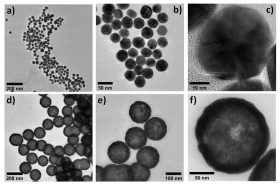 (a–c) TEM images of 40 nm gold nanoparticles. (d–f) TEM images of 150 nm gold nanoshells.
