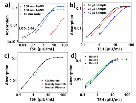 (a) Calibration curves for gold-nanoshell- and gold-nanoparticle-based LFAs with 50 µL of TSH calibrators. The calibration curve (black) obtained with gold nanoshells using DI water as blank showed an LOD of 0.04 µIU/mL. The calibration curve (blue) obtained with gold nanoshells using TSH-depleted serum as blank showed an LOD of 0.16 µIU/mL. (b) Calibration curves of gold-nanoshell-based LFAs with 10, 25, and 50 µL of TSH calibrators. (c) Calibration curve of gold-nanoshell-based LFA with 50 µL of TSH calibrators, quality controls, and human plasma samples. (d) Reproducibility of calibration curves on three different batches of TSH strips.