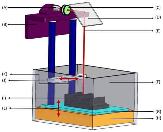 Stereolithography apparatus (SLA). (A) Laser—ultraviolet (UV) radiation source with low power; (B) Elevator—moves the build platform (shown in G) up during production as the laser beam solidifies bottom layers to top layers; (C) Lenses—concentrates the UV source to a focused laser beam to treat the surface of liquid photopolymer; (D) X-Y scanning mirror—deflects the beam from traveling horizontally to vertically downwards onto the liquid photopolymer (deflection of the mirror depends on the desired 3D-model); (E) Laser beam—liquid photosensitive polymers solidify upon contact with the laser beam, leaving untreated polymers liquid; (F) Vat—a large container holding photosensitive liquid; (G) Build platform—layers of photosensitive polymers are produced layer-by-layer from bottom to top and each layer represents a cross section of the final 3D product at every 50–200 μm; (H) Liquid photopolymer—photopolymers consist of a mixture of multifunctional monomers and oligomers; (I) Layered part—a combination of solidified photopolymer layers; (J) Sweeper—recoats the surface of the layered part with a liquid photopolymer resin as the build platform (in G) moves down after the solidification of each layer; (K,L) Motion of parts—right and left movement of the sweeper (in K) and up and down movement of the build platform (in L).