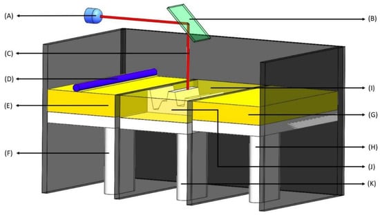 Selective laser sintering (SLS). (A) Laser source—UV radiation source; (B) X-Y scanner—changes X and Y coordinates for laser treatment based on the 3D model; (C) Laser—high power laser to sinter small polymer particle into solid structure; (D) Roller—produces single layers of powder; (E) Raw material—a powdered form of raw material such as polymers; (F) Recoater piston—travels upwards in one layer succession providing a new layer of powdered material; (G) Powder delivery system—a reservoir of powder that is delivered to the build chamber (in I); (H) Powder delivery piston—is raised to deliver the new layer of material; (I) Build chamber—powder is dispersed in a thin layer on top of the platform inside the build chamber; (J) Layered part—the final 3D product which is combination of all the layers; (K) Build piston—is lowered to add a new layer of material.