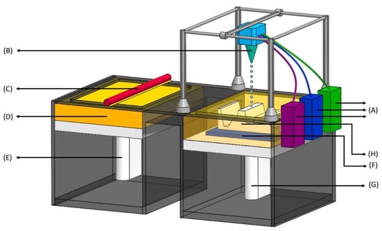 Inkjet printing process—drop-on-powder (DoP). (A) Binder feeders—reservoir of liquid ink containing polymers; (B) Inkjet printhead—contains a series of nozzles that dispenses a continuous stream of ink, printing in patterns to produce structures, and unused ink is recirculated back to the reservoir (in A); (C) Leveling roller—pushes a layer of raw material onto a powder bed; (D) Powder supply—reservoir of powder; (E) Powder feed piston—pushes up new layers of powder to leveling roller as the build piston (in G) comes down; (F) Powder bed—where the layered part (in H) is built; (G) Build piston—comes down after each subsequent layer is formed on the powder bed; (H) Layered part—the final product which is a combination of all the layers.