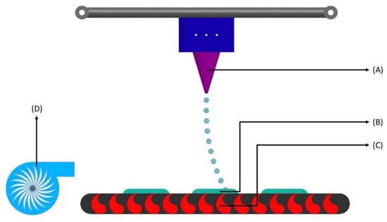 Inkjet printing process—drop-on-drop (DoD). (A) Optical adjuster—provides discontinuous droplets through short pressure wave pulses; (B) Layered part—the final product which is a combination of all the droplet-based layers; (C) Heat source—heat generates small air bubbles that activate the release of droplets; (D) Blower—directs heated air flow towards the layers of the ink composition.