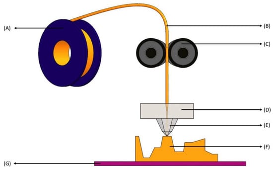 Fused filament fabrication printing process. (A) Filament spool—holds the filament and can be easily replaced with new spools; (B) Filament—comes from spool to the roller extruder (shown in C) and is the principal supply of material in this technique; (C) Roller extruder—the extruder pinches the filament as it enters and uses torque to feed or retract the precise amount of filament; (D) Heat extrusion head—contains a heater block that melts the filament to a desirable temperature for use; (E) Nozzle—squeezes the heated filament with smaller diameter; (F) Layered part—as the nozzle places the extruded material, the final product forms layer by layer; (G) Print bed—moves as the final product is being formed depending on the solid 3D model.