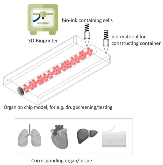 3D printing has been a promising candidate for the fabrication of an OoC platform due to its precise control of layer-by-layer assembly of biomaterials, such as an extracellular matrix (ECM), cells, etc. [74] While it is still in the early stages, 3D cell printing has displayed promising utilities in screening, testing drugs by modeling tissues and diseases [75], including skins [76], cancers [77], liver [78], lung [79], etc.