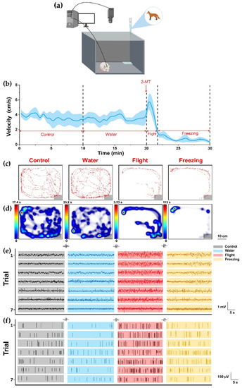 Predator odor potent simulant 2-methyl-2-thiazoline (2MT) was purchased from Shanghai Acmec Biochemical Co., Ltd. (China). In order to analyze the freezing behavior induced by 2-MT, rats were placed in an opening exposure cage (L × W × H = 40 × 50 × 40 cm), and an odorless filter paper was placed in the corner of the field to facilitate the application of each odor (Figure 2a). In our experiment, instead of providing rats with hiding opportunities as in other studies, we used the form of an exposure box without a hiding room, so that rats could not escape from the scope of the experiment and hide, and the most effective defense behaviors were freezing and flight (these two behaviors are also mainly discussed). Therefore, the rat defense stage was mainly composed of escape and freezing in our paradigm. Before the whole experiment, the rats were allowed to freely explore in the cage for 10 min to adapt the experimental environment (once a day, 4–6 days for continuous). Rats were also adapted to 10 min before each test. Each rat was subjected to the test of three phases. In the first phase, as a control group, the rat was allowed to explore freely in the cage for 10 min without external interference. In the second and third phases, 100 μL of deionized water (without 2-MT, water group) and 100 μL of 2-MT were dripped on the filter paper, respectively, and the rat continued to explore freely for 10 min. All tests are collected with a video recording system. Video analysis software Ethovision performed motion analysis of the decoded video to measure speed and spatial coordinates of rats. After each experiment, 75% ethanol was used to completely clean the exposure box, and it is placed in a fume hood for 1 h to prevent odor interference between the experiment. Rats were exposed to each tested odor (water or 2-MT, respectively) only once.