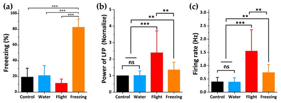 Fear is a crucial natural defense mechanism of humans and animals for survival and self-protection, which is one of the driving forces of species evolution [1,2]. As a basic emotion, fear can be evoked when the brain perceives the danger to induce animals to produce defense behavior and physiological response, such as escape and freezing, to increase the chance of animal survival. The emotional processing system in the brain controls such fear-related behaviors in animals, and abnormalities of the fear circuitry often result in pathological diseases, such as depression, panic disorder, and post-traumatic stress syndrome [3,4]. Fear can be innate or learned (conditioned) [3,5]. Innate fear, which is in the genes imprinted in the evolution process, essentially stems from the threat of dangerous objects [6]. Organisms often use odor information to mark territory, find food, identify similar species, and avoid natural enemies [6,7]. Therefore, previous studies on the innate fear of rodents mainly used the odors of predator hair, urine, and feces to stimulate rodents to perform innate fear and defensive behaviors [8]. Among them, the most commonly used is 2,3,5-Trimethyl-3-thiazoline (TMT) [9,10] and its derivative 2-methyl-2-thiazoline (2-MT) [11,12] extracted from the excrement of the fox, the natural enemy of rats, which can efficiently induce the instinctive freezing and other defensive behaviors of rats [13].