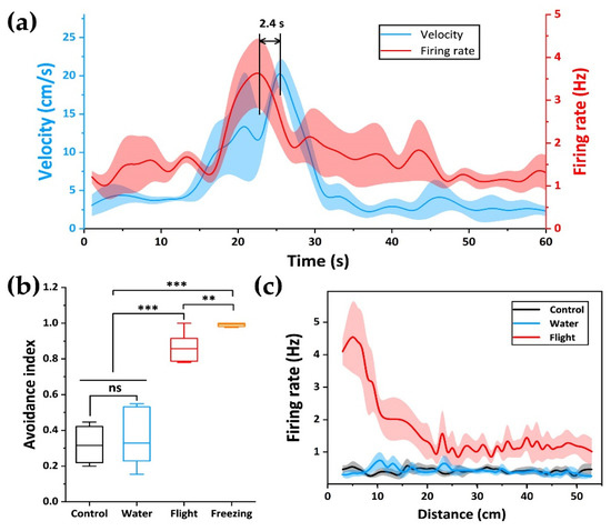The correlation between neurons and the flight behavior of rats during flight. (a) firing activity of neuron and the rats’ instantaneous velocity during flight. The data were the average speed in every 0.5 s; (b) avoidance index during four different periods. The middle line of the boxplot was the mean line; (c) firing rate plotted as a function of distance to the filter paper during control (black), water (blue) and flight (red). Firing rate was inversely proportional to distance during flight. Results were expressed as mean ± SEM. Statistical analysis was performed using Student’s t-test. ** p < 0.01, and *** p < 0.001.