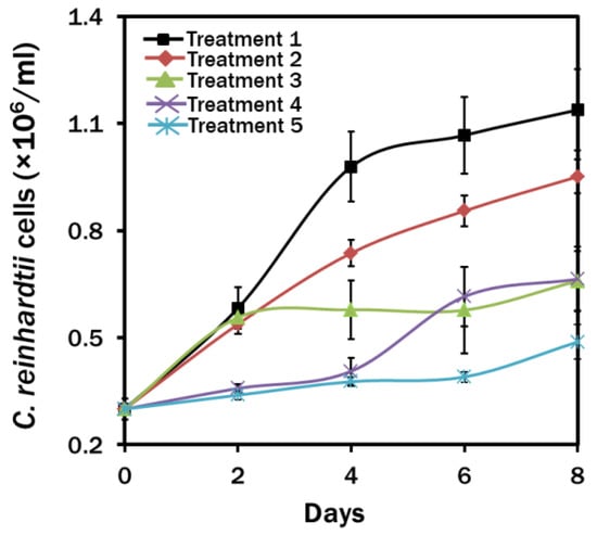 Moreover, FAs can affect human health and well-being through their direct and indirect association with different cellular functions. The effects of saturated fatty acids (SAFAs), monounsaturated fatty acids (MUFAs) and PUFAs are distinct. Thus, the FAs classes influence various diseases, including cardiovascular disease, metabolic disorder, type 2 diabetes, inflammatory diseases and cancer [,]. In this study, the FA profile of C. reinhardtii consisted of a range of SAFAs, MUFAs and PUFAs, whereas palmitic acid, linoleic acid and α-linolenic acids were predominant (Table 1). As Chlamydomonas and higher plants retained the same ancestry [], the FA composition of Chlamydomonas is almost similar to that of higher plants like Arabidopsis thaliana []. However, cultural conditions can significantly affect FAs content and composition [], which is also evident in this experiment as lipid-induced conditions of Treatment 3 (MBL, (−) N2, (−) Ca2+), Treatment 4 (MBL, (−) N2, (−) Ca2+, (+) sodium acetate (2.0 g/L)), 0.4 and 0.6 mM H2O2 supplemented MBL medium produced more ALA than the control group (MBL medium).