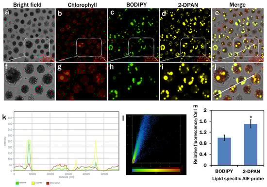 Confocal images of lipid drops in Chlamydomonas reinhardtii cells of Treatment 4 (MBL medium, (−) N2, (+) Sodium Acetate (2.0 g/L), (−) Ca2+, (24 h light condition)). Cells were labelled with traditional BODIPY™ 505/515 (5 μM; incubation-5 min) (c) and AIE probe, 2-DPAN (20 μM; incubation-30 min) (d). (Bright-field images: (a); Fluorescence images—Chlorophyll: (b) (λex: 488 nm, λem: 685–758 nm); BODIPY: (c) (λex: 488 nm, λem: 490–517 nm); 2-DPAN: (d) (λex: 488 nm, λem: 570–650 nm); Merged image: (e–i) and (j) are the enlarged regions of a–d respectively); (k) intensity profile of BODIPY and 2-DPAN in green and yellow channels, respectively; (l) intensity scatter plot for the colocalised channels; Pearson correlation coefficient and Mander’s overlap coefficient were calculated as 0.91 and 0.92, respectively; (m) Relative fluorescence intensity/cell for lipid-specific probes. Values are relative to the control BODIPY dye. Averages shown as mean ±SE; * p < 0.05. Images were taken with Zeiss LSM 880 Airyscan confocal microscope.