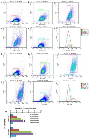 The plots from the flow cytometry indicated the efficient labelling of lipid drops in C. reinhardtii with BODIPY™ 505/515 and 2-DPAN (Figure 4a–m). Except Treatment 5 (MCM, (−) N2, (−) Ca2+, (+) sodium acetate (2.0 g/L) (24 h Dark) conditions), cytograms of BODIPY fluorescence vs. side scatter (Figure 4a–e) and 2-DPAN fluorescence vs. side scatter (Figure 4g–k) showed more lipid accumulation in the nutrient-starved cells than that of the nutrient-enriched cells of Treatment 1 (MCM medium under 24 h light condition) (Figure 4a,g). Maximum fluorescence was observed in N2 and Ca2+ deprived, but sodium acetate (2.0 g/L) supplemented light condition of Treatment 4 (Figure 4d,j), which was followed byTreatment 3 (N2 deprived, but sodium acetate (2.0 g/L) supplemented light condition) (Figure 4c,i). Moreover, greater side scatters in the nutrient-starved population indicated the obese phenotypes [,] caused by the lipid production and accumulation of probes within the LDs (Figure 4c,d,i,j), which was consistent with the higher relative lipid fluorescence per cell (Figure 4m). As it was evident that the nutrient-starved dark condition of Treatment 5 (Figure 4e,k,m) could not induce lipid production in C. reinhardtii cells, this treatment was deduced from the later confocal analysis.