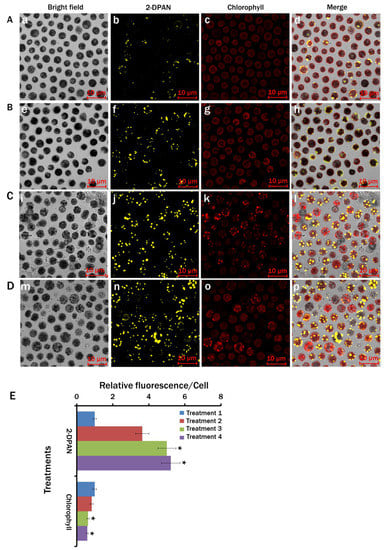 Labelling lipid drops with lipid-specific AIE nanoprobe, 2-DPAN (20 μM; incubation-30 min) in Chlamydomonas reinhardtii. Cells were cultured in (A) Treatment 1: modified Woods Hole (MBL) medium; (B) Treatment 2: MBL, (−) N2; (C) Treatment 3: MBL, (−) N2, (−) Ca2+; (D) Treatment 4: MBL, (−) N2, (−) Ca2+, (+) sodium acetate (2.0 g/L) (all the treatments were in 24 h light condition). Bright-field images: Aa,Be,Ci,Dm Fluorescence images-2-DPAN: Ab,Bf,Cj,Dn (λex: 488 nm, λem: 570–650 nm),and Chlorophyll: Ac,Bg,Ck,Do (λex: 488 nm, λem: 685–758 nm); Merged images: Ad,Bn,Cr,Dp. (E) Relative fluorescence intensity/cell for different treatments. Values are relative to the control condition (Treatment 1: modified Cramer–Myers medium (MCM)). Averages shown as mean ±SE; * p < 0.05; Images were taken with Zeiss LSM 880 Airyscan confocal microscope.