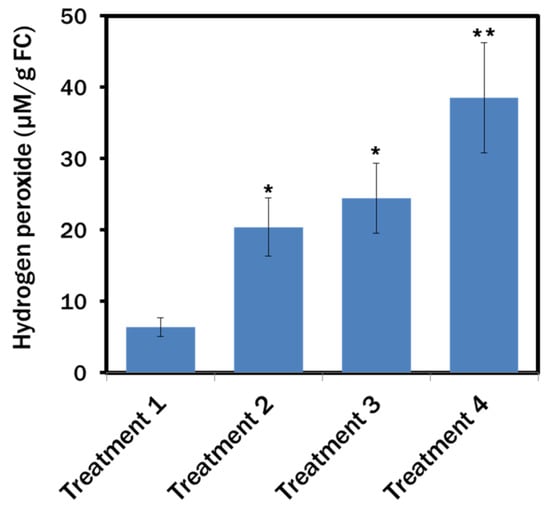 ROS was associated with the increased metabolite production in microalgae and high levels of H2O2 inside the microalgal cells were observed in a stress condition []. We determined the amount of H2O2 in lipid-induced C. reinhardtii cells. It was apparent that a maximum amount of 38.57 µM H2O2 was produced in 1 g of fresh microalgal cells of Treatment 4, where the maximum lipid was produced. Compared to the 6.38 µM H2O2/g of fresh microalgal cells of Treatment 1, about a 3.2-fold and 3.8-fold rise in H2O2 production was found in the cells of Treatment 2 and Treatment 3, respectively (Figure 6).