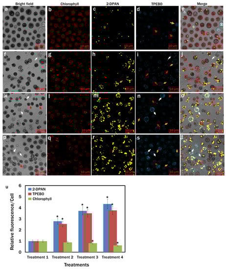 We used an H2O2-specific AIE probe, TPE-BO, to check H2O2 in C. reinhardtii with different cell membrane structures from an animal cell model []. Additionally, labelling LDs with AIE probe 2-DPAN under the same assay condition enabled us to visualise the H2O2 activities in the cells during lipid induction. From the confocal images, H2O2 activities were detected in all microalgae cells, whereas more activities were evident in the lipid accumulated (orange arrow) and autophagic cells (white arrow) (Figure 7). It was apparent that with the increase of lipid production in the cells, H2O2 activities were increased. In comparison to Treatment 1 (Figure 7d,u), a 2.5-and 3.5-fold rise in the H2O2 production was observed in Treatment 2 (Figure 7i,u) and Treatment 3 (Figure 7n,u), respectively. Maximum 3.8-fold higher H2O2 was found in Treatment 4, where the maximum lipid was biosynthesised (Figure 7s,u).